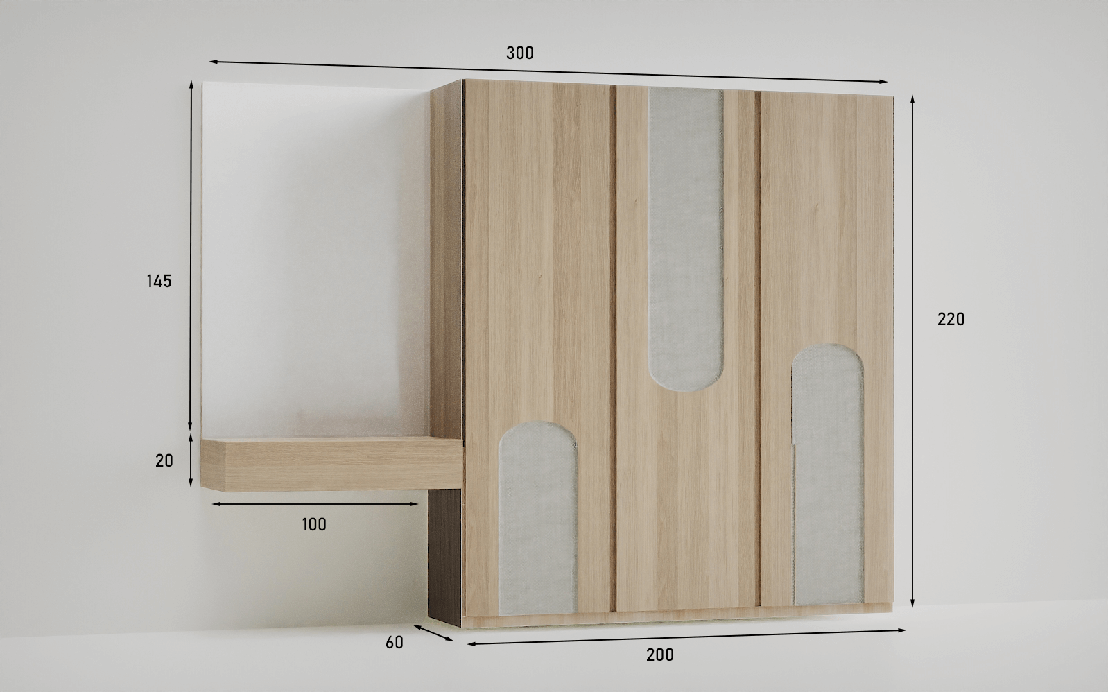 | دولاب | عرض 200 سم × عمق 60 سم × ارتفاع 220 سم |