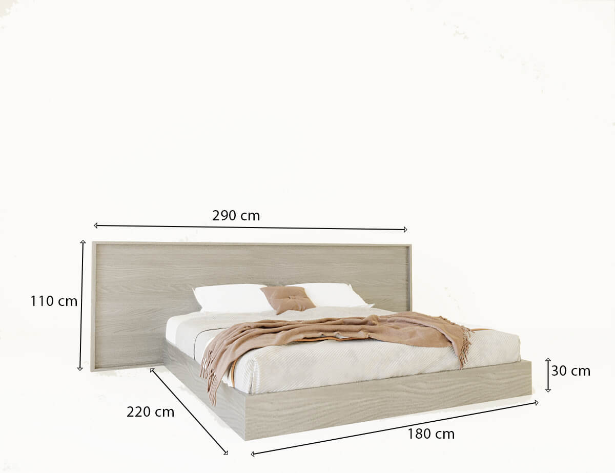 | السرير | عرض رأس السرير 290 سم عرض السرير 180 سم × الطول 220 سم × الارتفاع 110 سم |